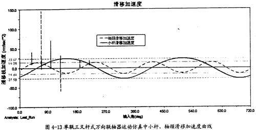由圖4-13可以知道,在一定的夾角下,小桿在滑道中有滑移加速度同小桿球面中心相對(duì)軸頸的滑移加速度是不同的,前者要大于后者,且它們變動(dòng)的頻率也不一樣,在一個(gè)回轉(zhuǎn)周期中,前頻率是1次,而后者2次。此圖中的兩曲線同第三章中的理論分析曲線圖3-13、圖3-14是吻合的,只是小桿滑移的加速度曲線在外形上有差異,仿真的曲線相當(dāng)?shù)钠交⒁?guī)則,但理論分析曲線卻不規(guī)則,這可能是在計(jì)算中簡(jiǎn)化和省略的原因。盡管如下,這在一定的程度上也證明了三叉桿式萬(wàn)向聯(lián)軸器理論分析中對(duì)小桿滑移加速度和軸頸滑移加速度這兩項(xiàng)計(jì)算的正確性。(值得說(shuō)明的是此圖中曲線有時(shí)有突變的現(xiàn)象,主要是考慮到計(jì)算機(jī)的性能,計(jì)算中步長(zhǎng)稍大的原故。在后面的分析曲線中也出現(xiàn)了這樣的情況,將不再作說(shuō)明。)