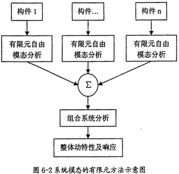 通過對系統(tǒng)中的各構(gòu)件進(jìn)行有限元自由模態(tài)分析,得到各構(gòu)件的自由模態(tài)(當(dāng)然也包含了6個剛體模態(tài)),以各構(gòu)件的連接關(guān)系為依據(jù),建立邊界條件,然后進(jìn)行模態(tài)綜合,即可計算得到整個系統(tǒng)的動特性和響應(yīng)。其過程如圖6-2。