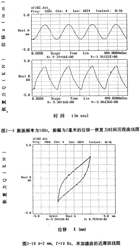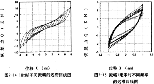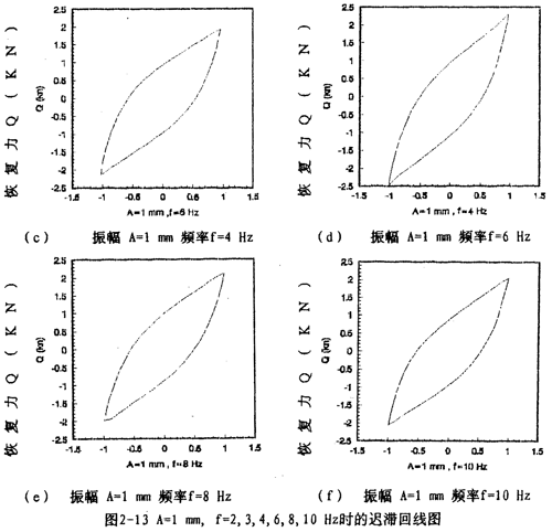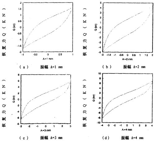 圖2-9(見26頁)表示激振頻率為1OHz,振動(dòng)位移幅值為±2毫米的位移和恢復(fù)力時(shí)間歷程圖,圖2-10(見26頁)、圖2-11(見27頁)為對應(yīng)的遲滯回線圖。圖2-l2(見27、28頁)表示激振頻率為IHz,振動(dòng)位移幅值分別為±(1-8)毫米的位移一恢復(fù)力圖,圖2-14(見29頁)則為圖2-12的合圖,由圖2-14同頻率不同振幅的八條遲滯回線分析可知,大撓度剛絲繩彈性聯(lián)軸器的動(dòng)剛度與振動(dòng)幅值有關(guān),同時(shí),從遲滯回線面積(表示聯(lián)軸器阻尼所耗散的能量)可知聯(lián)軸器的阻尼與振動(dòng)幅值也有關(guān),即聯(lián)軸器的動(dòng)剛度和阻尼均是振幅的非線性函數(shù)。