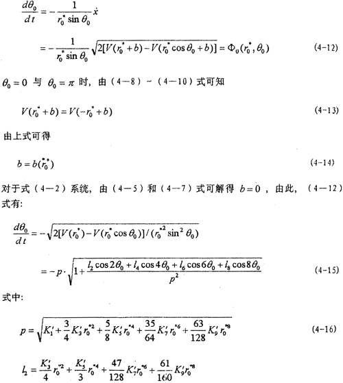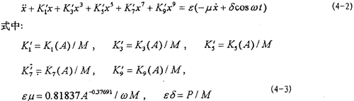 目前文獻(xiàn)上的一些方法對(duì)于弱非線性系統(tǒng)是有效的,而對(duì)于(4-2)式的強(qiáng)非線性系統(tǒng)則遇到了麻煩。由于描述非線性振動(dòng)系統(tǒng)的微分方程種類繁多,沒(méi)有普遍的解法,因此,仍然只有極少非線性振動(dòng)方程可求得精確解。可行的辦法是針對(duì)不同非線性振動(dòng)方程的特點(diǎn)尋求一些近似數(shù)值解法。為研究方便,將(4-2)式進(jìn)一步寫(xiě)成以下形式: