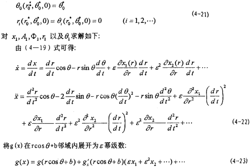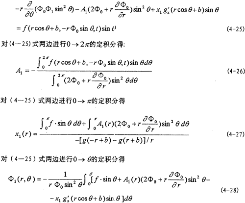 ,t)在rcosθ+b與-rф0sinθ鄰域內(nèi)以ε冪級(jí)數(shù)展開(kāi)式代入(4-4)式,由等號(hào)兩端ε的系數(shù)相等得: