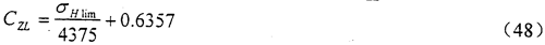 其中,在850N/mm2≤σH1im≤1200N/mm2范圍內(nèi),CZL可由式(47)算得。當σH1im<850N/mm2時取CZL=0.83;當σHlim>1200N/mm2時取CZL=0.91