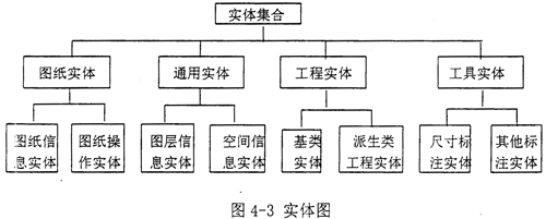 在面向?qū)ο蟮腃AD集成開(kāi)發(fā)系統(tǒng)里,系統(tǒng)數(shù)據(jù)模型的基本元素就是ARX開(kāi)發(fā)語(yǔ)言中的(多是C/C++語(yǔ)言)類,類實(shí)例化后稱為對(duì)象或?qū)嶓w,整個(gè)圖紙就是一個(gè)實(shí)體集合,主要由四大塊組成:圖紙實(shí)體集合、通用實(shí)體集合、工程實(shí)體集合和工程實(shí)體集合。其中,圖紙實(shí)體、通用實(shí)體和工具實(shí)體都為獨(dú)立類,沒(méi)有父類或子類;而工程實(shí)體集合中的各工程實(shí)體是由具有基本特征的基類實(shí)體派生而來(lái),具有一個(gè)基類和若干個(gè)派生類,并且各實(shí)體集之間互相獨(dú)立(如圖4-3所示)