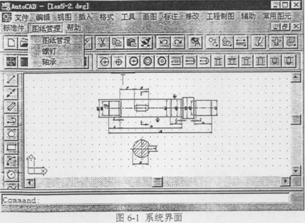 減速機計算機輔助設計、繪圖及圖紙管理系統(tǒng)主要包括MCADDS子系統(tǒng)和減速機CAD子系統(tǒng)二大部分,MCADDS系統(tǒng)是一個相對通用的圖形設計與圖紙管理系統(tǒng),適用于各種機械產(chǎn)品,包括符合國家標準的繪圖平臺、基于事物特性表的通標件庫和面向信息集成的圖紙管理等三個模塊;減速機CAD系統(tǒng)是針對減速機的設計計算開發(fā)的,對零部件具有通用性,包括齒輪嚙合校核、齒輪傳動系統(tǒng)的設計與校核。圖6-1為MCADDS系統(tǒng)界面。該系統(tǒng)的主要內(nèi)容如下: