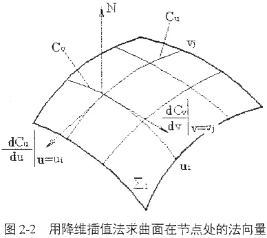 降維插直法就是從已知的數(shù)字化離散曲面出發(fā),將數(shù)字曲面分別沿下同的方向u,v構(gòu)造一個整體上具有二階連續(xù)導數(shù)的三次樣條插直曲線。兩條交叉的插直內(nèi)線在交叉點的切向量的向量積,就是數(shù)字化曲面在這一點的法向量N,如圖2-25所示。根據(jù)三次樣條插值的唯一性,由曲線插值所求得的法向量是相等的。然后按照曲面相對運動過程的共軛條件,建立求解極小值數(shù)學規(guī)劃模型,應(yīng)用優(yōu)化算法,即可求得與已知數(shù)字曲面Σ1、相共軛的數(shù)字化曲面Σ2。