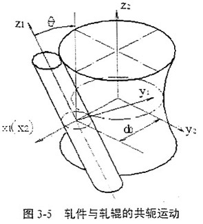 如圖3-5,軋輥軸線z2豎直放置,軋件軸線為z1,兩者交錯成θ角度,垂直距離為d0,軋件半徑為r0。在軋制過程中軋輥是轉(zhuǎn)動的,現(xiàn)在假設軋輥不轉(zhuǎn),根據(jù)相對運動原理,則軋件就以軋輥軸線為軸作旋轉(zhuǎn)運動,若軋件同時繞自身軸線回轉(zhuǎn),則軋件的相對運動包括自轉(zhuǎn)和公轉(zhuǎn)。以軋件為已知曲面Σ1,它與坐標系S1固連,轉(zhuǎn)動角速度為ω1,Σ1上的各點在S1中的用規(guī)則矩陣表示為X1(1),Y1(1),Z1(1);以軋輥為所求的共軛曲面Σ2,它與坐標系S2固連,轉(zhuǎn)動角速度為ω2,則軋件的運動可以用矩陣變換的形式表示為: