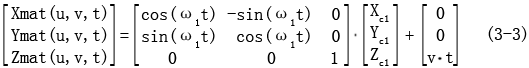 設已知接觸線為C1,它可以由三個一維數(shù)組Xc1,Yc1,Zc1表示,螺旋運動的角速度為ω,軸向移動速度為v,則由它生成的螺旋面可以用如下的坐標變換表示為: