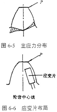 鼓形齒聯(lián)軸器內(nèi)外齒輪的嚙合齒對承受所作用的轉(zhuǎn)矩的作用,一般情況下,內(nèi)齒輪輪齒的剛度大于外齒輪輪齒的剛度,為了能更有效地反映應(yīng)變,工作應(yīng)變片貼于外齒輪輪齒的端面,溫度補(bǔ)償應(yīng)變片貼于不受力的相同材料上。輪齒的應(yīng)力狀態(tài)較復(fù)雜,在齒根處還存在應(yīng)力集中的情況下,但總的來說,對于一個(gè)齒,其齒根主應(yīng)力分布如圖6-5所示,因此考慮工作應(yīng)變片貼于輪齒中心線受拉應(yīng)力的一側(cè),靠近齒根邊緣處。這樣既不影響齒的嚙合,又能有效地反映接觸狀況,貼片布局如圖6-6所示。由于輪齒端面位置較為狹小,無法貼兩片應(yīng)變片,因此采用單臂工作方式測試。試件的選擇應(yīng)考慮加載量及貼片方便兩方面的因素,選擇模數(shù)較大的試件,便于貼片操作,但所需要加的載荷也較大,給操作帶來困難;反之則加載方便,但貼片較困難。綜合考慮上述兩方面的因素,并考慮能反映工業(yè)應(yīng)用的實(shí)際情況,本實(shí)驗(yàn)選用實(shí)際使用的鼓形齒聯(lián)軸器為試件,齒輪模數(shù)m=3mm,齒數(shù)z=56,其內(nèi)外齒加工精度分別為7級(jí)和6級(jí),材料均為ZG45鋼,熱處理為調(diào)質(zhì)處理,兩個(gè)鼓形齒輪分別為圓弧鼓度曲線和優(yōu)化鼓度曲線。