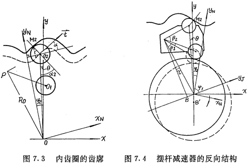 和推桿減速器一樣,當(dāng)理論擺動機(jī)構(gòu)數(shù)目比內(nèi)齒圈齒數(shù)少,即ZC=ZN-1時,機(jī)構(gòu)成為圖7.4所示的反向結(jié)構(gòu),在此結(jié)構(gòu)中,擺桿外滾子中心在與內(nèi)齒圈固聯(lián)的坐標(biāo)系(o,xN,yN)中的軌跡方程是: