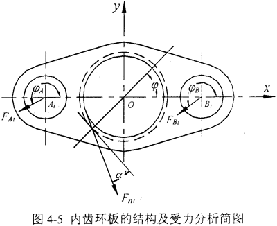 由圖4-7、4-8可知,內(nèi)齒環(huán)板的應(yīng)力與位移都以360°為周期變化,最大位移出現(xiàn)在φ=270°時的工況位置,這是因為此時的嚙合力Fni和Bi孔與配合軸間的作用力FBi都出現(xiàn)在φ=270°附近,它們的彎曲效應(yīng)和剪切效應(yīng)共同作用,出現(xiàn)位移的最大值點,同時也說明環(huán)板的最上部、最下部是環(huán)板位移的瓶頸環(huán)節(jié);最大應(yīng)力出現(xiàn)在180°+α′時的工況位置,這是因為此時的嚙合力Fni、Ai孔與配合軸間的作用力FAi和Bi孔與配合軸間的作用力FBi都出現(xiàn)在φ=180°附近,它們的彎曲效應(yīng)和剪切效應(yīng)共同作用,出現(xiàn)應(yīng)力的最大值點,同時也說明環(huán)板內(nèi)齒輪與兩個Ai孔、Bi孔的聯(lián)接部分是內(nèi)齒環(huán)板應(yīng)力的瓶頸環(huán)節(jié)。