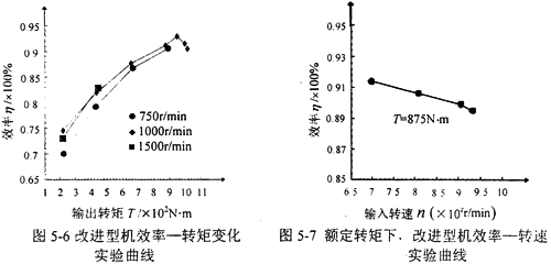 在額定轉(zhuǎn)速和額定轉(zhuǎn)矩范圍內(nèi),改進(jìn)型機隨著輸出轉(zhuǎn)矩、輸入轉(zhuǎn)速的增加,均載機構(gòu)補償?shù)恼`差增大,均載效果更加明顯,所以改進(jìn)型機的傳動效率隨輸入轉(zhuǎn)速的增加而增加。綜上所述,三環(huán)減速機的測得效率可達(dá)92%以上,因此本實驗從減速機的傳動性能上來講是成功的。