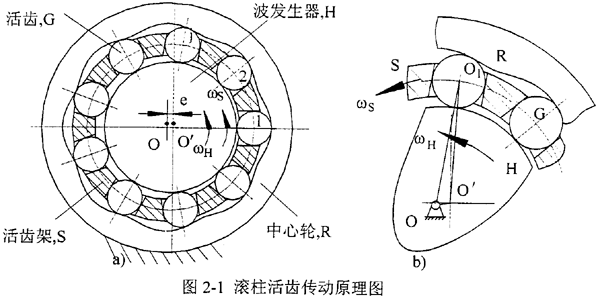 滾柱活齒傳動系統(tǒng)(見圖2-la)主要由波發(fā)生器H、活齒G、活齒架S、中心輪R四個部分組成。如圖2-lb所示,滾柱活齒傳動系統(tǒng)在工作時,輸入驅(qū)動力后,輸入軸以等角速度ωH,逆時針旋轉(zhuǎn),從而帶動波發(fā)生器使其幾何中心O′繞旋轉(zhuǎn)中心O以同樣角速度旋轉(zhuǎn),波發(fā)生器半徑變化的輪廓曲線產(chǎn)生徑向推力,迫使與中心輪工作齒廓接觸的諸活齒,在沿活齒架徑向?qū)Р垡苿拥耐瑫r,沿著中心輪工作齒廓滑滾,并通過活齒架的徑向?qū)Р弁苿踊铨X架以勻速ωS逆時針轉(zhuǎn)動,于是滾柱活齒傳動完成了輸入速度ωH、輸出速度ωS的轉(zhuǎn)速變換運動。而與中心輪非工作齒廓接觸的諸滾柱活齒,在活齒架徑向?qū)Р弁苿酉拢樞虻胤祷氐綄?dǎo)槽內(nèi)工作起始位置,從而分別完成了各自的運動循環(huán)。