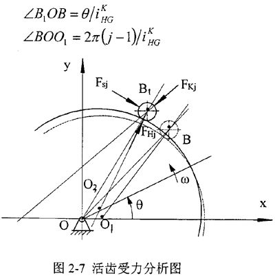 固定中心輪R,不失一般性,選擇活齒數(shù)ZG與中心輪齒數(shù)ZR之差為1。此時傳動比大小等于活齒個數(shù)。假設(shè)開始時,波發(fā)生器的幾何中心O1在X軸上,該活齒中心在B點,波發(fā)生器以角速度ω逆時針轉(zhuǎn)動。t時刻時,波發(fā)生器轉(zhuǎn)過θ角,該活齒中心運動到Bl點,波發(fā)生器的幾何中心從Ol運動到O2;Fsj、FHj、FKj分別為活齒架、波發(fā)生器、中心輪對該滾柱活齒的法向壓力。