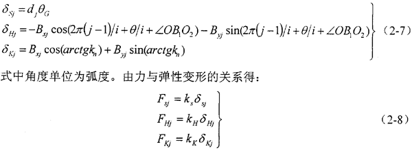 考慮變形協(xié)調(diào)條件,設(shè)第j個活齒的接觸變形量分別為δHj,δKj和δSj,導(dǎo)致活齒中心與旋轉(zhuǎn)中心O的連線OB1轉(zhuǎn)過微小角度θG,反映在坐標(biāo)系中,就是活齒中心B在水平和垂直兩方向微小的位移Bxj和Byj,可列: