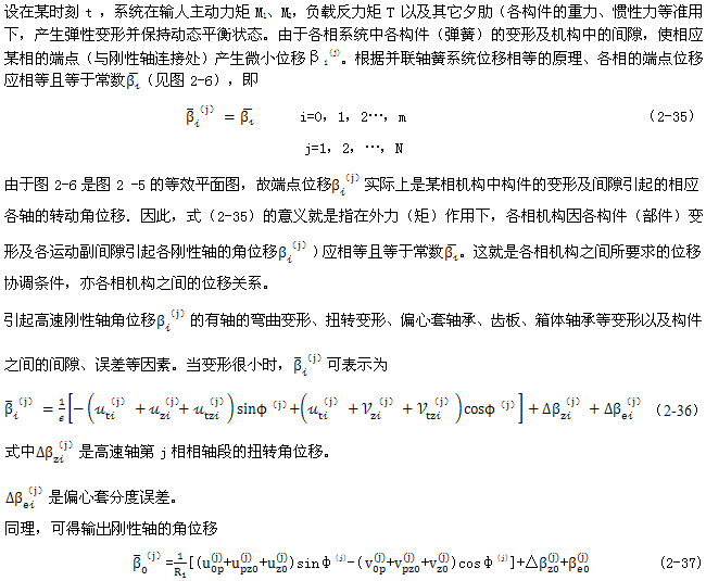 對于連桿行星齒輪傳動(dòng)機(jī)構(gòu)來說,為了克服機(jī)構(gòu)“死點(diǎn)”,一般是采用多相并列雙曲柄平行四邊形機(jī)構(gòu)或多曲柄平行四邊形機(jī)構(gòu)作為輸入機(jī)構(gòu)的。因此,它是多次靜不定的過約束機(jī)構(gòu)。要完全確定機(jī)構(gòu)的約束動(dòng)反力,必須尋求與其靜不定次數(shù)相同數(shù)目的位移協(xié)調(diào)補(bǔ)棄方程。過約束機(jī)構(gòu)的靜不定次數(shù)與運(yùn)動(dòng)構(gòu)件數(shù),運(yùn)動(dòng)副類型及其數(shù)量等有關(guān)。對于少齒差連桿行星齒輪傳動(dòng)機(jī)構(gòu),由于接觸承載輪齒對數(shù)因與載荷 大小,機(jī)構(gòu)的運(yùn)轉(zhuǎn)工況角的周期函數(shù)。因此,城要增加的機(jī)構(gòu)位移協(xié)調(diào)方程也是工況角的函數(shù)。