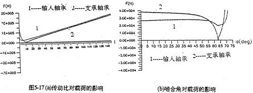由上式知,當(dāng)齒數(shù)差Z2-Z1越小或傳動比i越大時,偏心距e越小;壓力角越大時,偏心距e越大,則選用的行星軸承尺寸大,齒板高速軸承孔徑也就大。圖5-17是傳動比、壓力角、以減速器行星軸承載荷的影響。由圖可見,傳動比的變化對減速器的動力性能影響極大;傳動比越大,則偏心距越小。由式(5-30)分析得,行星軸承載荷必須大。壓力角的變化,對行星軸承載荷影響小得多。