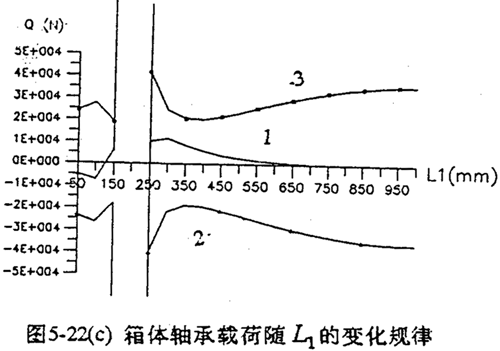 當(dāng)|L1-L2|≤50mm時,載荷產(chǎn)生沖擊為無窮大,L1≥400mm以后,隨著L1的增加,三相行星軸承載荷幅值變化很緩慢,接近于直線分布。但箱體軸承載荷的幅值在L1>350mm后,隨L1增加各相之間的幅值差變大,趨于不均衡狀態(tài)(見圖5-22c)。因此SHQ50型及SHQ63型的三環(huán)減速器的振動比SHQ40型的大。