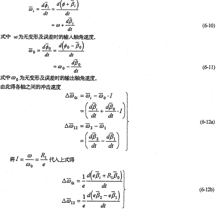 由于減速器機構的變形及各構件的誤差,使各傳動軸的角速度及角加速度不再滿足條件式(6-8)及式(6-9),亦在運轉(zhuǎn)過程中各軸之間存在角速度及角加速度的沖擊現(xiàn)象。該沖擊將直接導致系統(tǒng)振動,使輸出速度產(chǎn)生波動、降低其輸出的穩(wěn)定性,并產(chǎn)生沖擊載荷。
