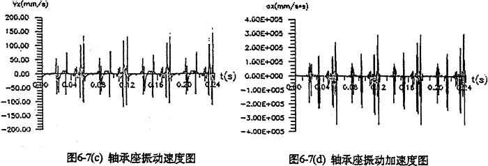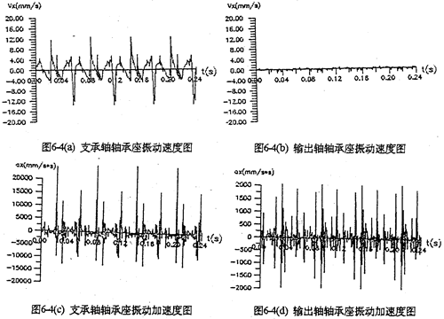 圖6-4是支承軸軸承座及輸出軸軸承座的振動速度及振動加速度時域圖。圖(c)中,一個周期內(nèi)的三根較長的沖擊棒線分別是三相機構因死點引起的嚙合沖擊。軸承座的振動速度比齒板的振動速度小,但振動加速度比齒板振動加速芳略大,最大值為