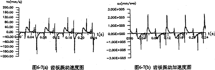 圖6-7是某相雙曲柄機構在輸入端具有0.03mm間隙時,齒板及軸承座的振動速度、振動加速度。圖中表明,速度、加速度都在兩個死點位置出現(xiàn)較大的沖擊值。