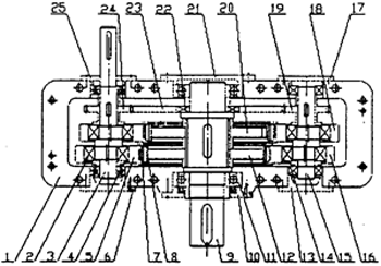 1—箱體,2、4、11、14、22—軸承,3、15—高速軸,5、18—環(huán)板,6、10、13、17、21、25—端蓋,7—針齒,8—滾動套,9—低速軸,7、10、20—擺線輪,16—螺針,19、24—小齒輪,23—過橋齒輪。