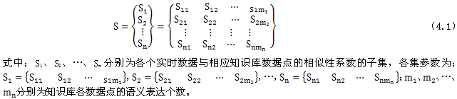 專家系統(tǒng)推理主要是從知識庫所需的數(shù)據(jù)集合D={D1、D2、…、Dn}出發(fā),根據(jù)知識庫中每一數(shù)據(jù)點(diǎn)相應(yīng)的一個(gè)或多個(gè)語義表達(dá)和數(shù)據(jù)范圍,將獲取實(shí)時(shí)數(shù)據(jù)與知識庫中相應(yīng)數(shù)據(jù)的語義表達(dá)和數(shù)據(jù)范圍進(jìn)行相似性分析,得出相似性系數(shù)的集合: