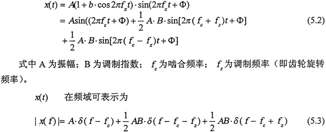 若xc(t)=A·sin(2πfet+φ)為嚙合振動載波信號,a(x)=1+b·cosπfzt為齒輪軸的旋轉(zhuǎn)調(diào)制信號,則調(diào)幅后的振動信號