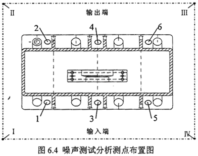 結(jié)構(gòu)振動(dòng)噪聲測(cè)試在齒輪箱安裝基腳布置6個(gè)測(cè)點(diǎn),測(cè)點(diǎn)布置圖見圖3中1-6測(cè)點(diǎn),在每一測(cè)點(diǎn)上按31.5Hz~5kHz1/3倍頻中心頻率測(cè)試加速度級(jí)頻譜(re:a0=10-6m/s)和1/3倍頻中心頻率測(cè)試速度級(jí)頻譜(re:a0=5*10-8m/s)?諝庠肼暅y(cè)試聲壓級(jí)基準(zhǔn)2*10-5Pa,用聲級(jí)計(jì)上的A計(jì)權(quán)聲壓級(jí)和1/1倍頻程聲壓級(jí)測(cè)量減速齒輪裝置各個(gè)測(cè)點(diǎn)。各測(cè)點(diǎn)距齒箱測(cè)量表面的距離為1米。測(cè)點(diǎn)位置見測(cè)點(diǎn)布置圖6.4中Ⅰ-Ⅳ測(cè)點(diǎn)。