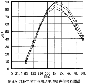 圖6.9為四種工況平均空氣噪聲倍頻程圖譜。由于減速齒輪裝置只是整個(gè)試驗(yàn)系統(tǒng)的一部分,在測(cè)試時(shí),發(fā)聲系統(tǒng)除齒輪箱外,還包括電動(dòng)機(jī)、風(fēng)機(jī)及車間內(nèi)其它相鄰設(shè)備等背景噪聲源,它們將影響減速齒輪裝置的噪聲測(cè)量結(jié)果。考慮這些影響,根據(jù)國(guó)家標(biāo)準(zhǔn)《齒輪裝置噪聲聲功率級(jí)測(cè)定方法》(GB6404-1986)的規(guī)定,按各測(cè)點(diǎn)上測(cè)得的1/1倍頻程聲壓級(jí)做對(duì)數(shù)平均,然后進(jìn)行修正,以得到實(shí)際的1/1倍頻程聲壓級(jí)空氣噪聲值。圖6.9為修正后的齒輪減速裝置的倍頻程平均空氣噪聲圖譜。表3為各測(cè)點(diǎn)A 聲級(jí)空氣噪聲值