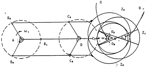 如圖7-1示,三環(huán)減速器三套平面四桿機構AB1C1D-01、AB2C2D2-02、AB3C3O3及外齒輪見圖中所示。在圖示位置時,平面四桿機構AB1C1D處理死點位置,運動處于不確定運動狀態(tài),由于嚙合力的作用將產和瞬間的沖擊力。為了能除去或減少該沖擊力的作用,我們在一定的角度θ內對AB1C1D上的內齒輪進行修形,使在死點位置時,平面四桿機構AB1C1D不受嚙合力或少受嚙合力作用,這樣,通過其余兩套平面四桿機構就能較易將其速成過死點位置,從而達到減不止或消除過死點的沖擊。同樣,對另兩套平面四桿機構AB2C2D2及AB3C3O3作同樣的修形。這種方法我們已正在試驗過程中。