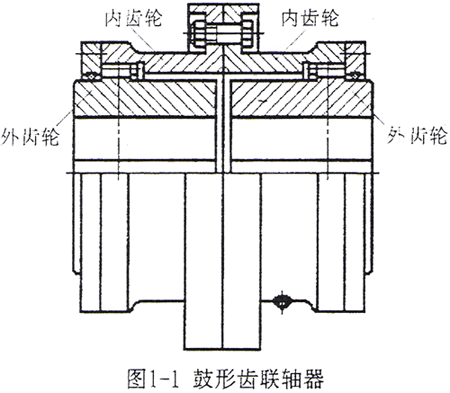 鼓形齒聯(lián)軸器(結(jié)構(gòu)如圖1-1所示)是機械傳動的重要基礎(chǔ)部件,它是在直齒齒輪聯(lián)軸器基礎(chǔ)上為滿足大傾角、變化傾角、大傳遞轉(zhuǎn)矩、小尺寸、高可靠性等要求發(fā)展起來的。它已在冶金、采礦、化工、起重運輸?shù)葯C械設(shè)備中廣泛應(yīng)用[65-67]。尤其是在冶金設(shè)備中更是大量采用。如武鋼引進的一米七軋機系統(tǒng)中裝機量達2500套。國際上一些工業(yè)發(fā)達國家五十年代就有鼓形齒聯(lián)軸器的應(yīng)用。我國近十幾年來從國外引進的成套和單機設(shè)備中大量采用了鼓形齒聯(lián)軸器。國內(nèi)雖在六十年代開始在軋機主傳動上應(yīng)用了鼓形齒聯(lián)軸器,但是設(shè)計制造技術(shù)落后,沒有廣泛推廣應(yīng)用。近十幾年來,國內(nèi)一些廠家為了滿足從國外引進設(shè)備的鼓形齒聯(lián)軸器的進口設(shè)備備件需要,通過消化吸收引進技術(shù),進行批量仿制鼓形齒聯(lián)軸器,同時進行較深入的機理研究[69-79]。但未建立一套自己的完整合理的設(shè)計方法,制造技術(shù)也較落后。