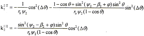 在齒高方向,由于k2Ⅰ與ψ1和t1有關(guān),是否存在在曲率干涉,需進(jìn)行計(jì)算才能確定。在齒寬中截面上,k2Ⅰ=1/(rbψ1),由于內(nèi)外齒輪存在軸間傾角θ,由Eular公式可計(jì)算出與k2Ⅱ同方向的外齒輪齒面法曲率,k2Ⅰ′=cos2θ/(rbψ1)。由接觸點(diǎn)計(jì)算知,在齒寬中截面上的接觸點(diǎn)ψ1=ψ2,因此存在k2Ⅰ′<k2Ⅱ,即說(shuō)明存在曲率干涉,且θ越大,曲率干涉越嚴(yán)重。
