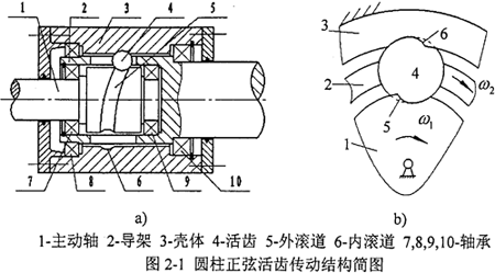 圖2-1所示為圓柱正弦活齒傳動(dòng)機(jī)構(gòu)的結(jié)構(gòu)簡圖,圓柱正弦活齒傳動(dòng)由主動(dòng)軸、殼體、導(dǎo)架及活齒這四個(gè)部分組成。殼體的內(nèi)圓柱表面上有周期數(shù)為Z3的內(nèi)正弦滾道,軸承7、8、9、10支撐導(dǎo)架,導(dǎo)架圓周面上均勻分布著軸向活齒槽。軸承7、9支撐主動(dòng)軸,其外圓柱面上有周期數(shù)為Z1的外正弦滾道,在內(nèi)滾道、外滾道及導(dǎo)架活齒槽的交錯(cuò)區(qū)域內(nèi)安裝有球形活齒。