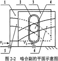 圓柱正弦活齒傳動(dòng)是空間傳動(dòng)機(jī)構(gòu),其空間正弦滾道具有周期性,將該傳動(dòng)沿圓柱直母線方向展開,則機(jī)構(gòu)的運(yùn)動(dòng)將轉(zhuǎn)化為如圖2-2所示的平面運(yùn)動(dòng)。由此,它的自由度計(jì)算可利用平面自由度公式進(jìn)行計(jì)算,主動(dòng)軸、導(dǎo)架及殼體相對于固定機(jī)架各有一個(gè)轉(zhuǎn)動(dòng)副,活齒與這三個(gè)構(gòu)件間形成三個(gè)高副,活齒本身存在一個(gè)局部自由度F′,則圓柱正弦活齒傳動(dòng)的自由度F為F=3n-2PL-PH-F′=3×4-2×3-3-1-2。由此可見,這是一個(gè)差動(dòng)機(jī)構(gòu),給定兩個(gè)原動(dòng)件,傳動(dòng)機(jī)構(gòu)才會有確定的運(yùn)動(dòng)。當(dāng)固定殼體、導(dǎo)架及主動(dòng)軸之一時(shí),傳動(dòng)機(jī)構(gòu)的自由度為1。在圖2-2中各部件的含義同圖2-1,若殼體固定,主動(dòng)軸為動(dòng)力輸入軸,當(dāng)主動(dòng)軸轉(zhuǎn)動(dòng)時(shí),主動(dòng)軸上的外正弦滾道推動(dòng)活齒運(yùn)動(dòng),在主動(dòng)軸外正弦滾道及殼體內(nèi)正弦滾道的共同約束限制下,活齒繞公共軸線的圓周方向作等速運(yùn)動(dòng),同時(shí)推動(dòng)導(dǎo)架的活齒槽,由導(dǎo)架輸出動(dòng)力。