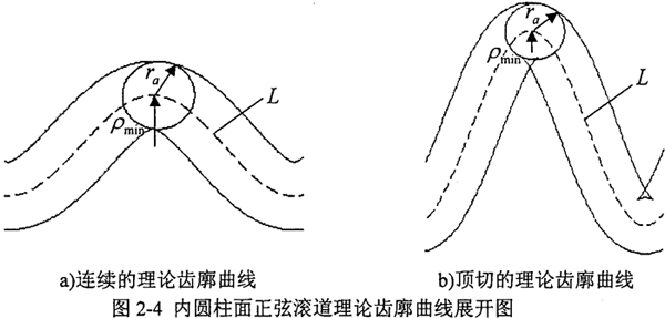 以殼體的正弦滾道為例,將殼體的內(nèi)圓柱面沿圓柱直母線方向展開后如圖2-4所示。當(dāng)殼體內(nèi)圓柱面上正弦軌跡曲線L的最小曲率半徑ρmin大于活齒嚙合部分小圓半徑ra時(shí),殼體正弦滾道的理論齒廓曲線是連續(xù)的(圖2-4a);當(dāng)ρmin<ra時(shí),理論齒廓曲線發(fā)生頂切(圖2-4b)。殼體內(nèi)圓柱上正弦軌跡曲線L的方程可表達(dá)為: