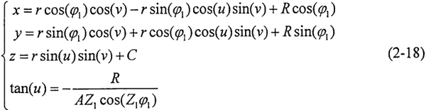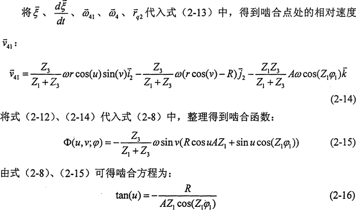 將活齒齒面方程(2-8)的坐標(biāo)轉(zhuǎn)換到σ1上,并與嚙合方程(2-16)聯(lián)立,即可得到主動(dòng)軸齒面∑1的方程,即