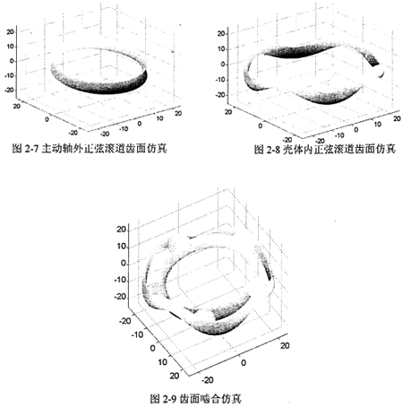 采用Matlab工程軟件對圓柱正弦活齒傳動(dòng)進(jìn)行齒面仿真的研究。為仿真出三維曲面,在接觸線上劃分100個(gè)單元,在齒面圓周方向劃分1001個(gè)單元,由此將齒廓曲而劃分為100×1001的網(wǎng)格。根據(jù)數(shù)學(xué)模型計(jì)算出各個(gè)網(wǎng)格節(jié)點(diǎn)對應(yīng)的數(shù)值,得到齒廓曲面的網(wǎng)格圖,然后采用二維線性插值的方法,得到整個(gè)齒廓的曲面仿真及齒面嚙合偏真如圖2-7~圖2-9所示。