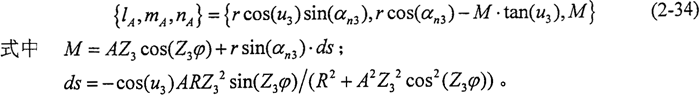 由式(2-33)可求得軌跡曲線LA的切線方程,為便于計(jì)算,將其轉(zhuǎn)換到活齒坐標(biāo)系中,該方程的方向數(shù)為: