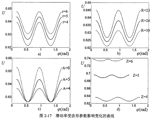 投影到瞬時(shí)接觸線的法線方向得到v10t和,v1t,將二者代入式(2-38),計(jì)算出滑動(dòng)率。由于正弦滾道形狀具有周期性,因此共軛齒面間的滑動(dòng)率也呈現(xiàn)周期性變化,考慮齒形參數(shù)——活齒半徑r、活齒中心回轉(zhuǎn)半徑R、正弦幅值A(chǔ)及殼體滾道正弦周期數(shù)Z對(duì)滑動(dòng)率的影響,若給定其中任意三個(gè)參數(shù),改變另一個(gè)參數(shù),可以得到在一個(gè)工作周期內(nèi)滑動(dòng)率隨齒形參數(shù)的變化規(guī)律曲線如圖2-17所示。