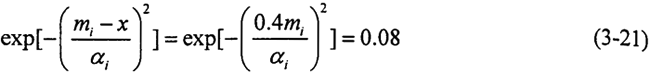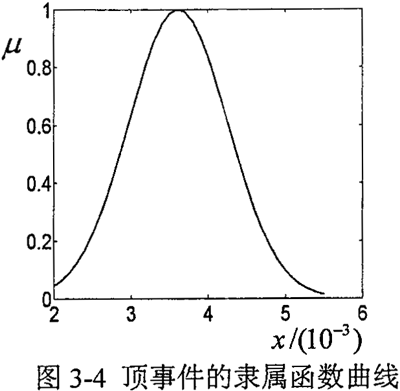 故障樹中各事件發(fā)生的概率用模糊數(shù)來表示,根據(jù)模糊數(shù)的運(yùn)算法則式(3-13)、(3-15)和模糊算子AND和OR的計(jì)算方法式(3-18)、(3-20)即可確定頂事件發(fā)生的模糊概率。假定事件發(fā)生概率Pi的參照函數(shù)為正態(tài)對稱型,其隸屬函數(shù)如式(3-11)所示,且與均值mi相差±40%的點(diǎn)x的隸屬度為0.08,則