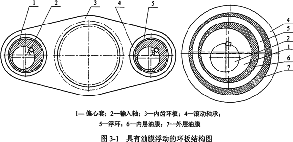 由于三環(huán)減速器充分地利用了功率分流和內(nèi)嚙合多齒接觸的原理,因此,三環(huán)減速器的承載能力較大。上一章的受力分析和振動分析表明:采用三片內(nèi)齒環(huán)板偏心之間呈180°相位角的布置形式,能夠?qū)崿F(xiàn)慣性力和慣性力矩的完全平衡,又使得嚙合力對振動的影響減小,采用雙軸輸入又可使三環(huán)減速器各環(huán)板所受的嚙合力相等,避免機構(gòu)的過死點的沖擊,改善高速軸的受力情況,提高傳動系統(tǒng)的效率。在雙軸輸入和完全平衡狀態(tài)下,嚙合力對輸出軸支撐軸承的作用力和作用力矩也完全平衡。由于不可避免的制造和安裝誤差及動力傳遞過程中出現(xiàn)的零部件變形,使得三片內(nèi)齒環(huán)板之間的作用載荷分配不均勻,引起動載荷增加,導致振動加劇,造成齒面點蝕、軸承損壞、齒輪箱發(fā)熱,甚至發(fā)生事故。本文提出的同步帶傳動作為一級傳動的完全平衡均載減振的三環(huán)減速器,可實現(xiàn)減速器齒輪傳動部分的慣性力和慣性力矩完全平衡和三環(huán)傳動的雙軸輸入,克服了死點位置沖擊和振動較大的問題。該減速器的油膜浮動實現(xiàn)了三蘇減速器均載和減振。由于本文提出的油膜浮動方案是在旋轉(zhuǎn)的偏心軸表面與轉(zhuǎn)臂軸承之間插入一個圓柱套筒形成的,并受到一個動載荷的作用,其動力學研究尚未見到相關(guān)的報道,本章對油膜浮動動力學的有關(guān)問題進行研究。