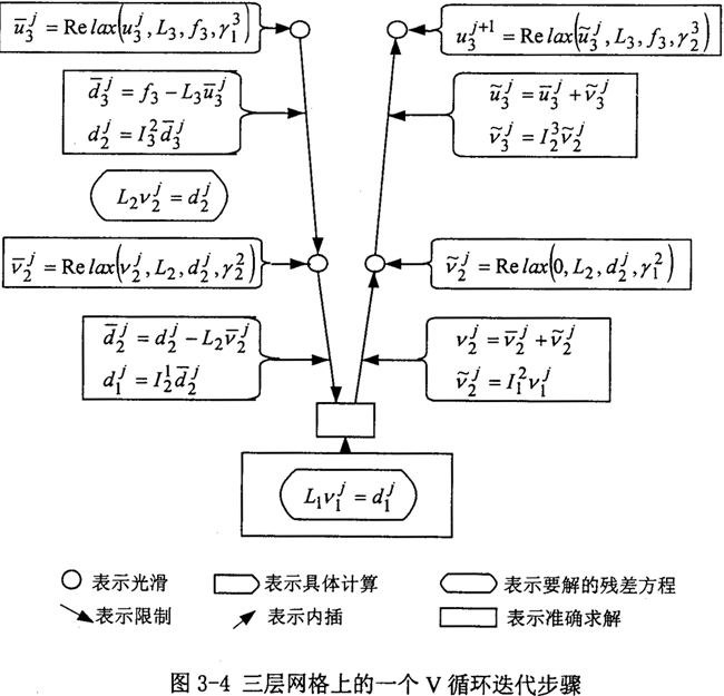 圖3-4所示為三層網(wǎng)格上的一個循環(huán)的具體計算步驟。
