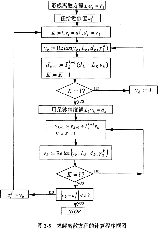 圖3-5所示為l個網(wǎng)格層上利用V循環(huán)求解離散方程(3-31)式計算框圖。