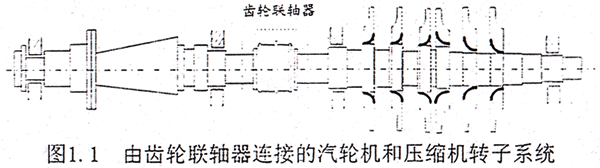 以往在對軸承一轉(zhuǎn)子系統(tǒng)進行動力學分析的過程中,對于構(gòu)成系統(tǒng)的一些典型部件,如轉(zhuǎn)子、支承軸承、密封以及基礎(chǔ)都作過較深入的研究,但對于聯(lián)軸器耦合效應(yīng)的討論卻不多。直觀地講,多跨轉(zhuǎn)子正是依賴多個聯(lián)軸器才得以構(gòu)成大型系統(tǒng)的,因此更確切地講對于大型的多跨(或分跨)轉(zhuǎn)子系統(tǒng)可以稱為軸承—轉(zhuǎn)子—聯(lián)軸器系統(tǒng)。以大型的汽輪發(fā)電機組和壓縮機組為例,汽輪發(fā)電機組在低壓轉(zhuǎn)子、發(fā)電機轉(zhuǎn)子以及勵磁機轉(zhuǎn)子間均采用了剛性或半撓性聯(lián)軸器結(jié)構(gòu);對于壓縮機組,在壓縮機轉(zhuǎn)子和驅(qū)動設(shè)備如驅(qū)動汽輪機轉(zhuǎn)子或電機轉(zhuǎn)子之間也要采用不同形式的聯(lián)軸器。圖1.1所示是一透平壓縮機組的簡圖,為一典型的軸承—轉(zhuǎn)子—齒輪聯(lián)軸器系統(tǒng),整體系統(tǒng)由一個CL型的齒輪聯(lián)軸器將汽輪機轉(zhuǎn)了和壓縮機主軸連接組成。