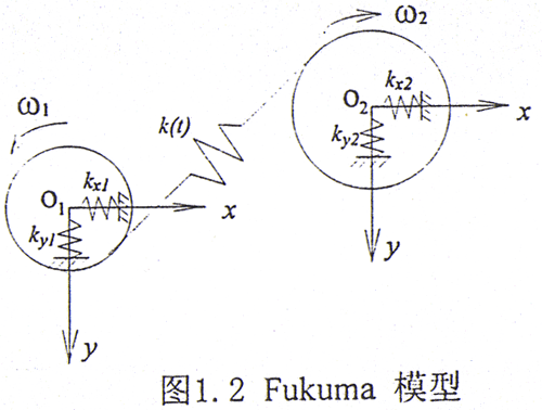 齒輪是機械系統(tǒng)中一個非常重要的部件,主要用于傳遞轉(zhuǎn)子之間的運動。對于外齒輪耦合轉(zhuǎn)子軸承系統(tǒng)的研究已經(jīng)進行了數(shù)十年[14],比較典型的模型有Fukuma[15]、IWATSUBO[16]、Kahraman[17]模型和彎扭耦合模型[18],其中[15,18]中的模型分別如圖1.2和圖1.3所示。這些模型的共同特點是將嚙合的輪齒看成能夠產(chǎn)生變形的彈簧,同時考慮了齒輪中心的橫向位移和繞中心轉(zhuǎn)動的扭轉(zhuǎn)角位移,這樣對一個外齒輪而方Fukuma[15]模型就具有三個自由度,一對嚙合的外齒輪共有六個自由度;而彎扭耦合模型[18]則考慮了齒輪之間的嚙合關(guān)系,這一關(guān)系相當與給系統(tǒng)增加了一個約束,使得系統(tǒng)的自由度減少了一個,因此是一個五自由度模型。