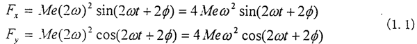 不對中具有一些典型的特征,如不對中比較嚴重時會使軸承的油膜壓力偏離正常值,聯(lián)軸器不對中時聯(lián)軸器兩端軸承的振動較大,軸心位置不穩(wěn)定,而且在振動頻譜中二倍頻分量幅值較大等。而對于齒輪聯(lián)軸器不對中產(chǎn)生倍頻振動分量的機理研究又是其中的一個重點。文獻[68]指出,由于安裝時轉(zhuǎn)子軸心線不對中引起的振動,在用電機驅(qū)動的轉(zhuǎn)子系統(tǒng)中,當電機軸與負載機械由齒輪聯(lián)軸器連接時,電機軸存在二倍頻的振動,而在單獨運動時,倍頻振動立即消失,這表明倍頻振動完全是齒輪聯(lián)軸器耦合的結(jié)果。文獻[64,65]解釋了由于齒輪聯(lián)軸器不對勁中而產(chǎn)生二倍頻振動的機理,以[65]中的軸線平行位移不對中為例見圖1.4,圖中ω為轉(zhuǎn)子的轉(zhuǎn)動的解速度,2e為不對中量,M為內(nèi)齒套的質(zhì)量,φ0為起始回轉(zhuǎn)角。