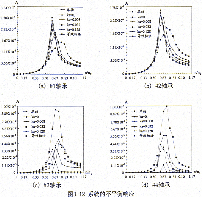 (3)用單軸分析法和等效軸法計(jì)算系統(tǒng)的臨界轉(zhuǎn)速和不平衡響應(yīng)均會(huì)出現(xiàn)較大的誤差。單軸分析法忽視了齒輪聯(lián)軸器對(duì)二側(cè)轉(zhuǎn)子的耦合作用,而等效軸法則過分夸大了這種作用。