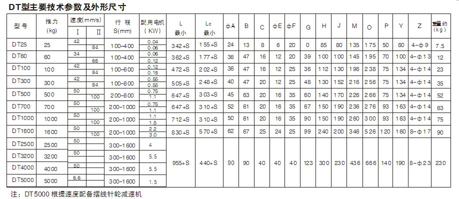 DT系列電動推桿是一種將電能轉換成往復運動機械能的通用機械手,適用于各種復雜或簡單的工藝流程,具有結構緊湊,安裝方便,使用可靠,維修簡單,節(jié)約能源等優(yōu)點。與液壓氣動系統(tǒng)相比,不但省掉了繁雜的系統(tǒng)和減輕了重量,而且不受氣候及環(huán)境的限制,可實現(xiàn)遠距離集中或自動控制,廣泛應用于冶金、礦山、電力、煤炭、交通、糧食、化工、建材等部門。 二、電動推桿結構與性能: 1、結構: 電動推桿由電動機、減速齒輪、絲桿、銅螺母、導向套、活塞桿、軸承座、軸承座、彈簧、缸筒座、聯(lián)接叉及光電接近開關裝置(用戶選購)等部件所組成。 2、工作原理: 電動機通過一級或二級齒輪減速后,帶動絲杠螺母付,把電動機的旋轉運動變?yōu)橹本運動,利 用電動機正反轉實現(xiàn)推桿往復動作。輸出推拉力相等。通過各種杠桿力臂長度,可以增長行程。 3、過載自動保護功能: 電動推桿內(nèi)過載自動保護裝置,當推桿行程到極限位置或負載超過額定推力一定數(shù)值時,推桿 將自動切斷電源,起到保護作用,使電動機及其它構件不致?lián)p壞,但不得以此作為正常運行時的限 位開關使用。因此要求在本機上另行配置外行程限位開關裝置,本廠可為用戶配置光電接近開關裝 置,以控制推桿正常起停。 一、原理和功能