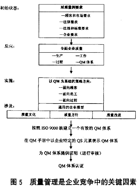 圖5 對本文所討論的企業(yè)競爭中的重要因素——質(zhì)量管理進(jìn)行總結(jié)。出發(fā)點(diǎn)是對各個方面提出的質(zhì)量要求作詳細(xì)說明。為滿足質(zhì)量要求作出的反應(yīng),是提出全面企業(yè)質(zhì)量概念,這包括與產(chǎn)品、服務(wù)、過程和系統(tǒng)相關(guān)的質(zhì)量元素。